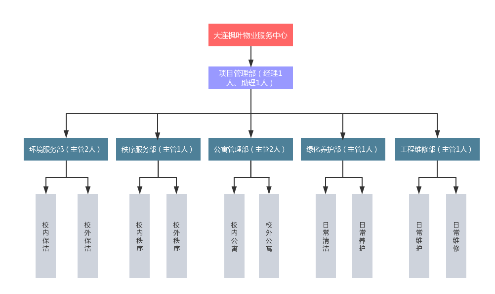 大连枫叶职业技术学院坐落于大连市甘井子区营城子镇大黑石旅游区度假村0号,是辽宁省政府批准、国家教育部备案,具有高等学历教育的民办普通高等职业学院。枫叶学院物业中心为明德集团大连分公司开发的高校类物业综合服务项目,办公室位于校内图书馆的南侧,室内使用面积约200平方米。内部设有办公区、档案管理区、小型会议区、企业宣传区及物品存放区。服务中心设有物业管理部、环境服务部、秩序维护部、绿化养护部及工程维修部。服务面积9万平方米。服务中心的全体人员始终以超值服务、精益求精的企业精神来服务于客户,提供优质的服务方案来解决客户的实际需求。源于心诚,止于完善,客户满意就是我们的追求。